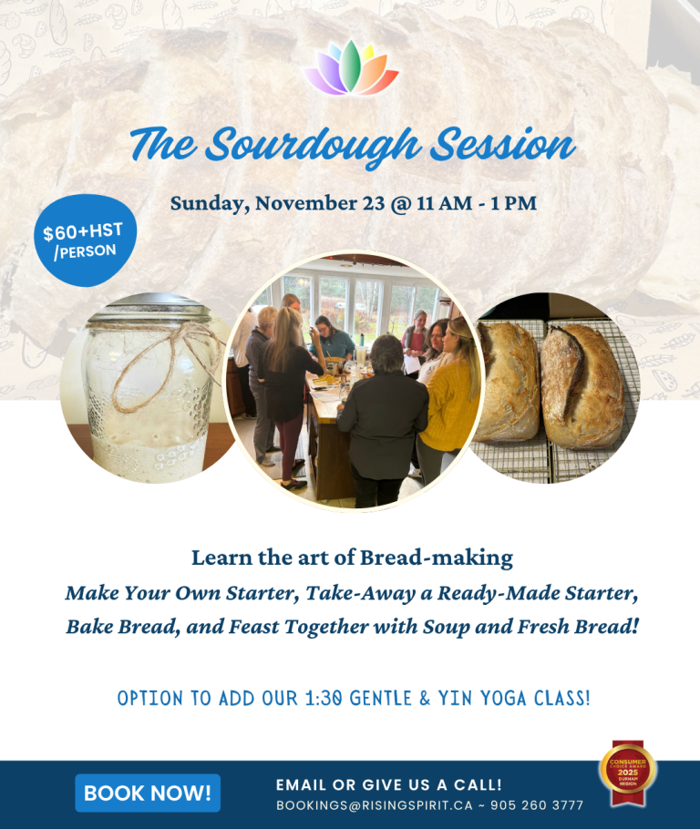 You’ll leave with your very own sourdough starter to prepare your next loaf at home! And if you’d like to extend your day of nourishment, there’s an optional gentle/yin yoga classat 1:30 to deepen your sense of calm and connection.